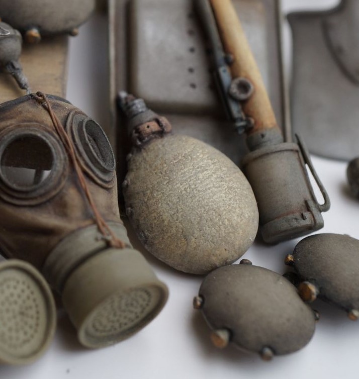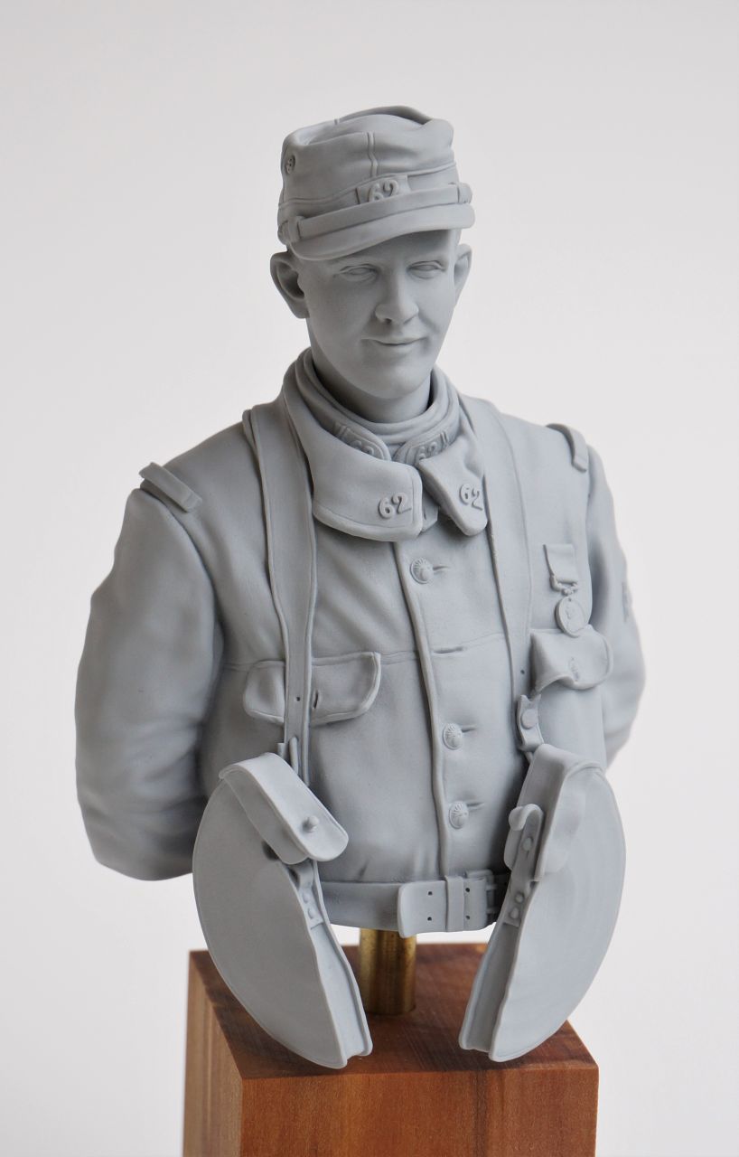 I have attempted to produce a bust which is not only historically correct, but also fun to build and challenging to paint. The reproduction of the gas mask glasses in miniature and the muddle of neck cloth, neck band and shirt around the open collar, were just 2 of the more tricky areas to solve. Help has been given to me as always by WW1 collectors, enthusiast and modelling friends, not only on uniform and equipment research, but also in identifying the German units fighting in this particular area and time of the Passchendaele battles during 1917.