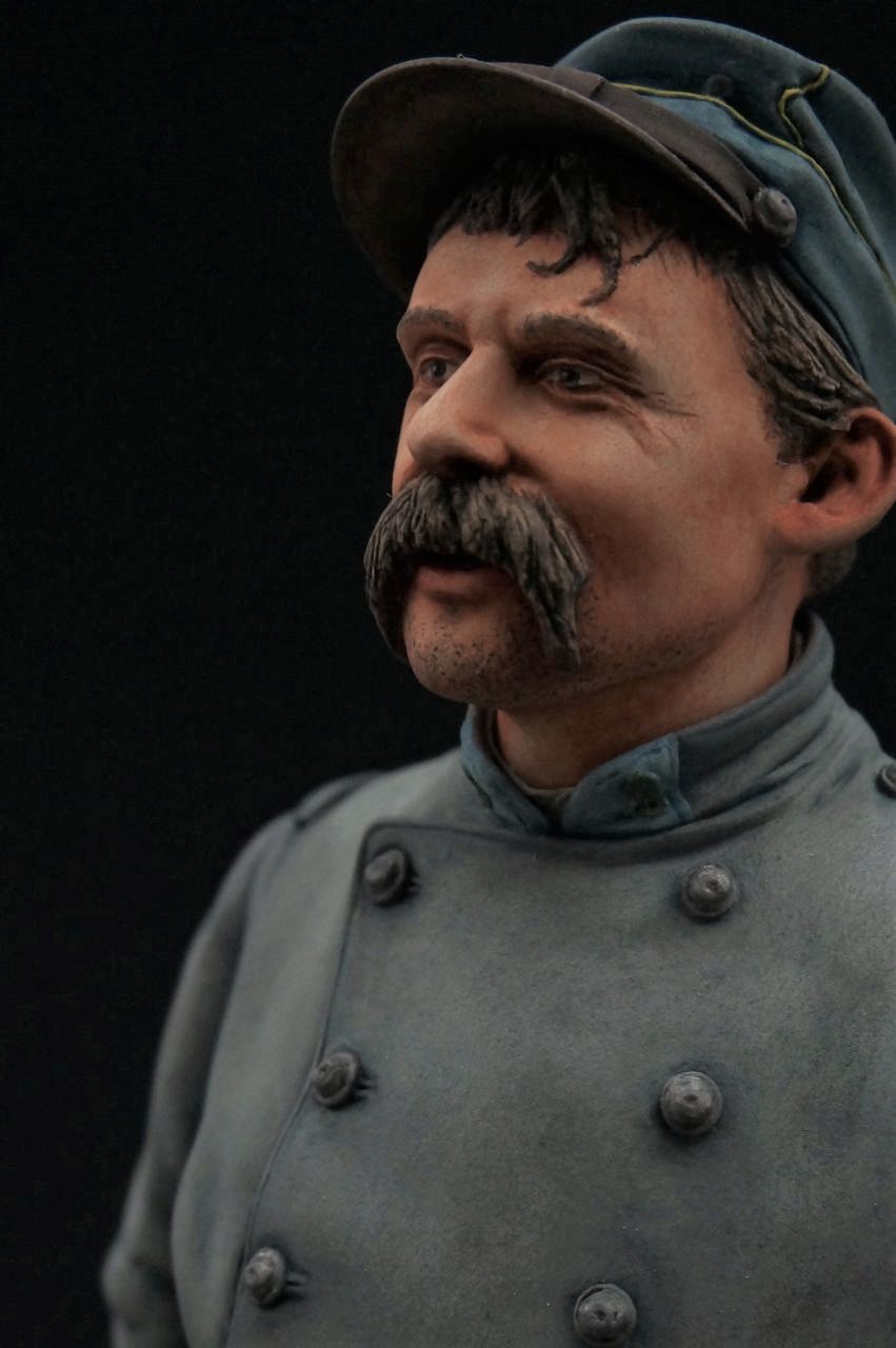 The Bust: the reference material for this character was taken from two photos displaying Chasseurs light infantry mingling with British troops and civilians in a French or Belgium village, probably early autumn 1914 or the spring of 1915. This somewhat dishevelled character is sporting longer hair than would normally be the case and an unkempt moustache, which may indicate an extended period in the front area. The stand-up collar is open at the front and just showing what seems to be a top of a shirt or neck tie. The leather chin-strap to the kepi has become loose and has slipped forward, hanging partly over the cap visor and his right ear. The kepi itself has been pushed back and to one side of the head in a casual fashion. The shoulder strap attachment buttons are slightly off-centre to the top of the greatcoat and lean forward – this can be seen on many contemporary photos of this period. This Chasseur belonged to the 8th battalion, garrisoned at Etain, which at the outbreak of war in August 1914 belonged to the 83rd Brigade (42nd Division, VI Corps).