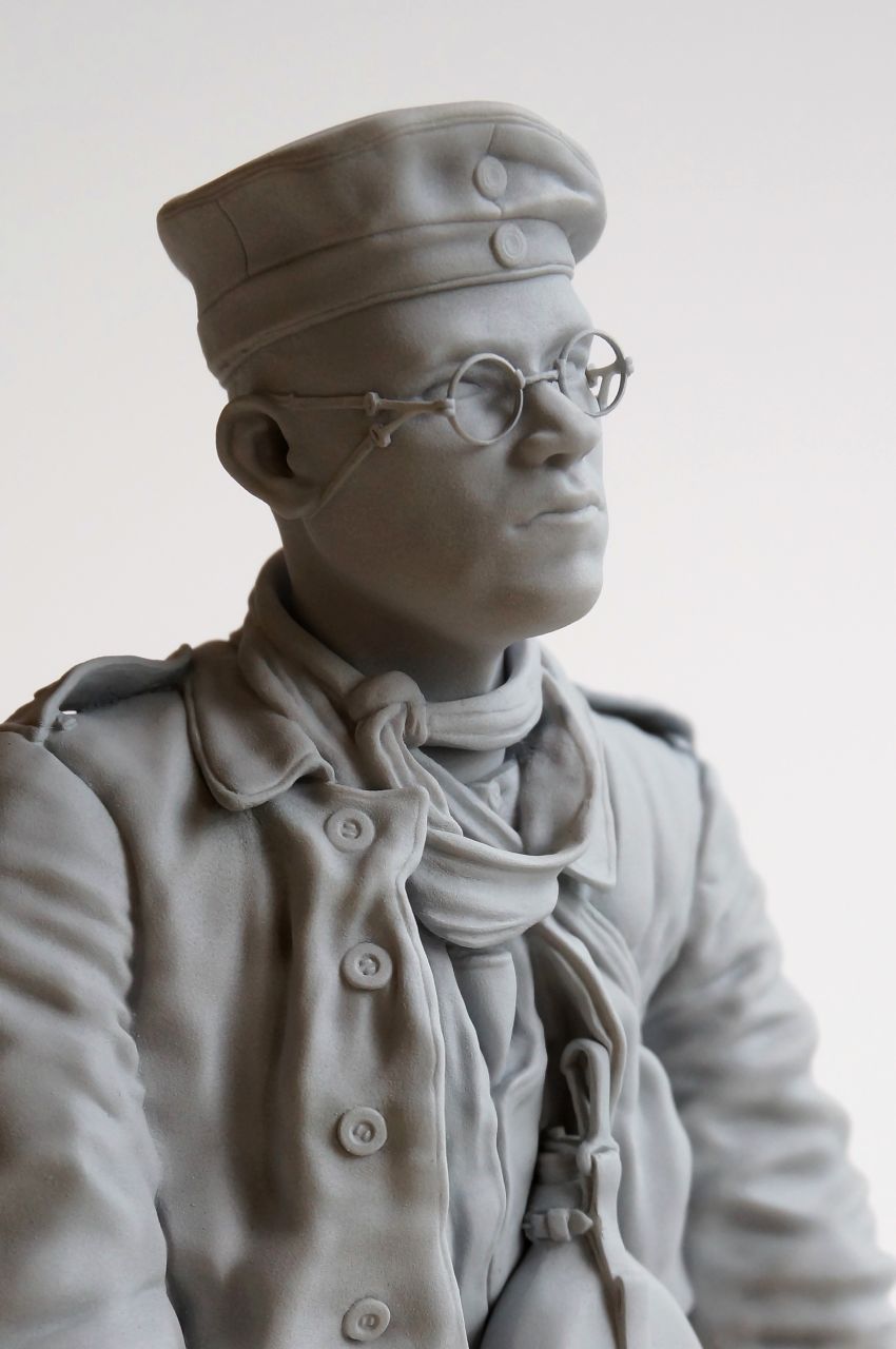I have designed the bust with the Prussian State emblem buckle – a crown and motto GOTT MIT UNS. The belt on the original photo seems slightly off-centre, with the buckle moved around to the right. That this is a Prussian soldier is indicated by the crown shown on the open tunic pocket button (not shown on bust).