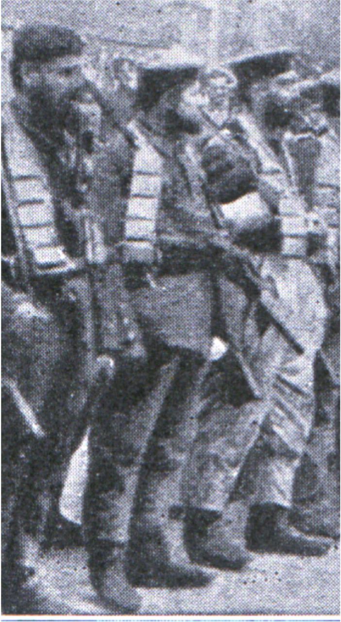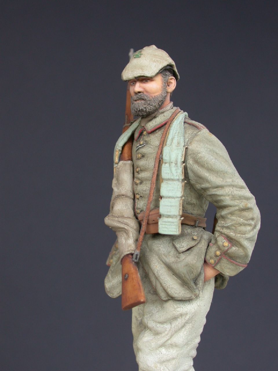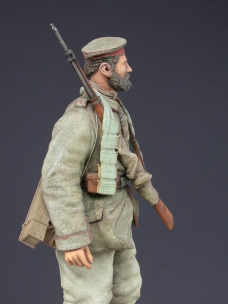 The figure depicts a member of an infantry platoon marching through a small Belgium town on their way to the trenches. A stocky, well-built character, he is marching in the middle of the first row, with two platoon NCOs and officer in front. These men are dressed for the wet, cold and muddy conditions of trench warfare. They all wear the cotton overall trousers, some tucked into the boots, others have them hanging loose around the ankles. Just before leaving the billets each man was issued a bandolier of extra ammunition to carry around his neck. The sound of the men’s boots on the cobbled road is quite considerable and people are standing watching as the platoon, which with the exception of the officer and but a few of the very younger members all have full beards, go marching by.