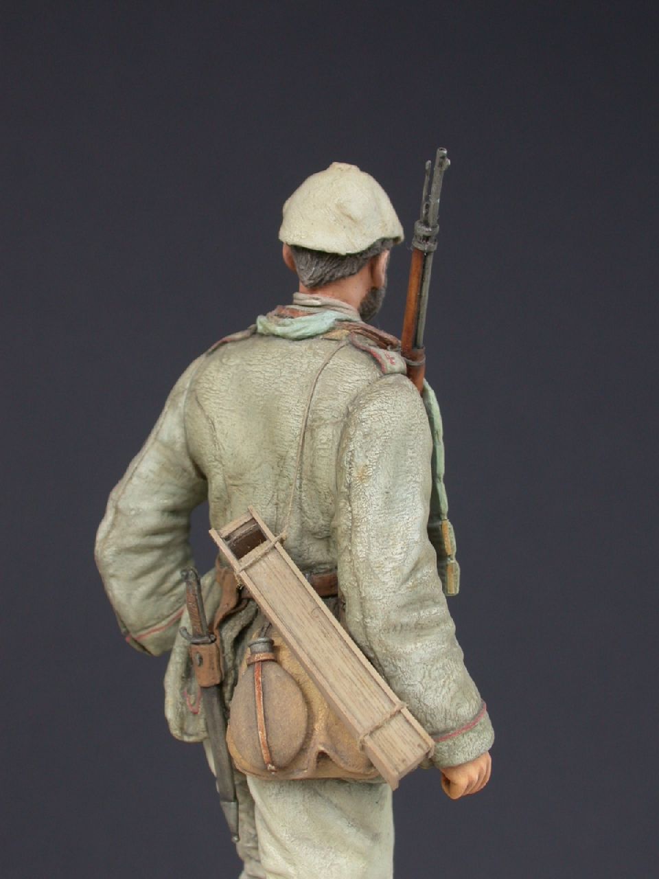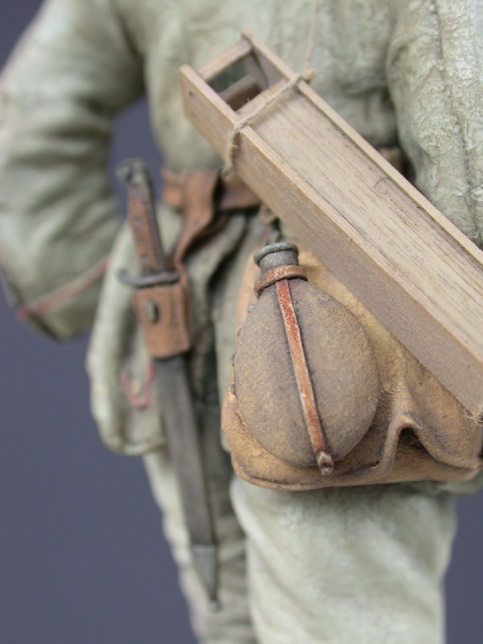 Bandolier: The bandolier was a practical way for carrying extra ammunition and still used in many armies today. This type was designed to hold 70 rounds – 14 x 5 in clips. The bottom 2 pockets on each side were double. Inside, a strip of v-shaped card was fixed along the points of the rounds to stop them damaging (pushing through) the material. On the outside of the pockets are the opening strips (rip off cords), made out of natural coloured sack-material. On some photos one can see 2 lengths of thick string at each end of the bandolier, presumably to attach to equipment. These, for obvious reasons are not on the figure, but can easily be made from cotton thread. Troops would also tuck the bandolier ends into their belts. The fact that this was a `one off – throw away´ item and that it was made out of a thin, low quality material, means that there are few original bandoliers to be seen today and are a sort-after item by collectors. The right hand part of the bandolier, when fixed to the figure should hang freely. Colour: bandolier – blue/grey. Opening strips – brownish-yellow.