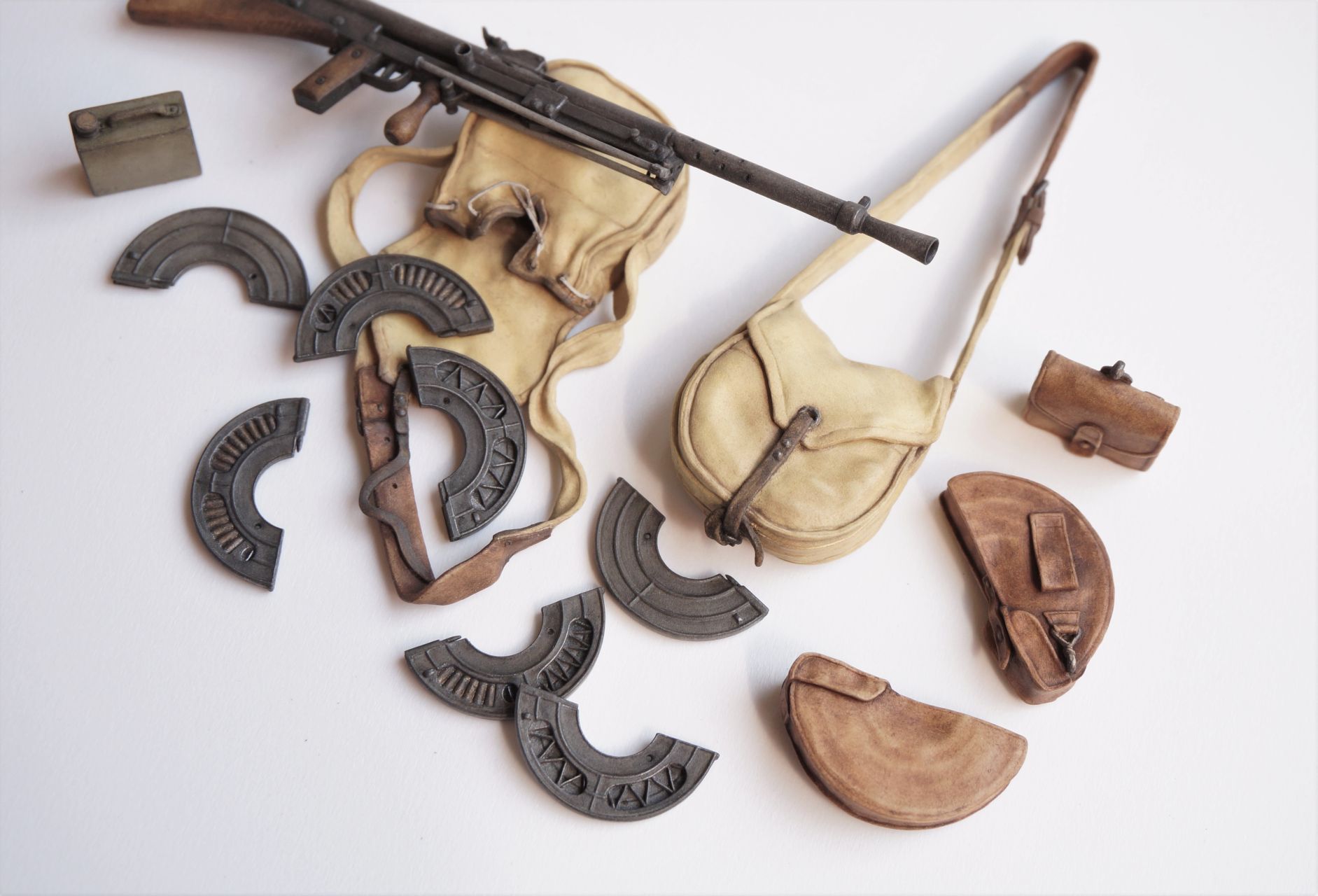 To attach a magazine to the MG, it is required to sand down the top part slightly, until the correct position is required. I would advise checking out original photographs beforehand. One of the magazines with 9 rounds supplied in this set has already been cut-down to enable a correct attachment to MG. This magazine has been placed within same bag as MG.