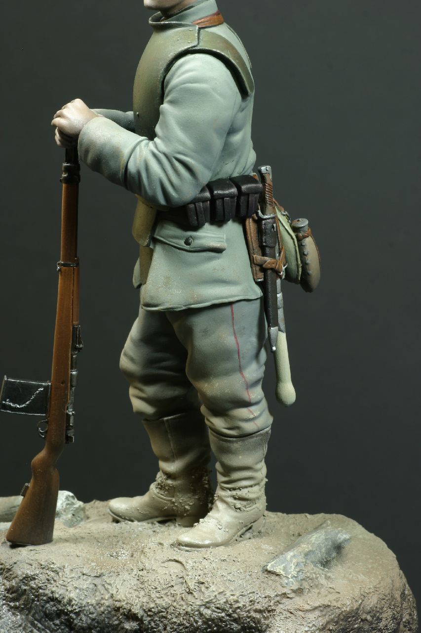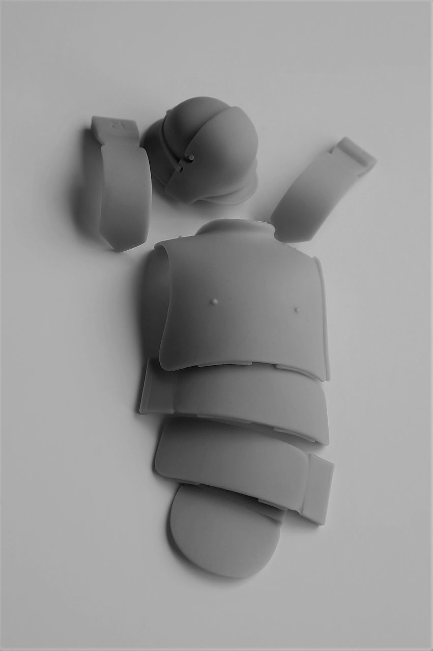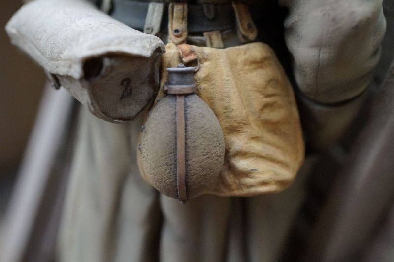 The armour was issued in different models, but basically 2 types can be discovered when searching for photos or original items. The first is the plain / first issue type (worn by this figure). The second model has 2 additional equipment support hooks on the main breast plate, along with a rifle bracket welded to the top area and attachment slits for securing a strap to go around the body and hold the armour in place. The weight, depending on the manufacture was between 8 and 10 Kg and appears to of been issued in either 2 or 3 different sizes.