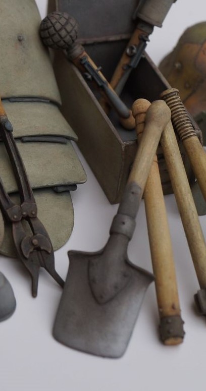 1/16 (120mm) German Steel Body Armour Set / Grabenpanzer Set 1/16 (120mm) German Steel Body Armour Set / Grabenpanzer Set Stückpreis: 12,90 EUR Endpreis zzgl. Shipping cost Gewicht: 9,00 g German Steel Body Armour Set / Grabenpanzer Set Scale / Maßstab: 1/16th (120mm) Material: Resin Parts / Teile: 5 Infosheet / Infoblatt: English Code / Artikel-Nr.: IS66 Attention: Not a toy. Model kit or model making accessories – not suitable for children under 14 years of age. / Achtung: Kein Spielzeug. Modellbauzubehör – nicht für Kinder unter 14 Jahren geeignet GPSR Data / Angaben Manufacturer / Hersteller: Jon Smith Modellbau Responsible Person / Verantwortliche Person Address: Hannoverstr. 68, 29664 Walsrode, Germany Contact / Kontakt: info@jonsmith-modellbau.com Tel: +49 (0)5161 8255 Contents / Inhalt: Body Armour (3 parts) / Grabenpanzer (3 Teile) Helmet Armour / Stirmschild (für Stahlhelm) Steel Helmet M.16 / Stahlhelm M.16 Note: the wooden post, shelf & base are not included, but can be purchased separately if required – please contact Jon Smith directly either per email or telephone. This Body Armour Set is intended for the diorama / model display. The Body Armour – Single Segment Set (item about) is intended for adding to an existing figure of choice. Steel Body Armour / Grabenpanzer or Sappenpanzer: Devised by the German Army and introduced in 1916 for protection against light infantry weapons and shrapnel. This special nickel/silicon steel body armour, or trench armour was issued to predominantly exposed troops such as snipers, MG troops and sentries within the Front Line areas. The armor consisted of a breastplate, with 3 overlapping protective sections for the stomach and groin. 2 shoulder plates fixed with 3 rivets on each side held the armour over the body. The individual plates were connected with 2 webbing straps fastened onto the inside of the armour starting on the breast section where the two rivets are situated. Rectangular horsehair felt pads were stitched to the webbing strap to lay in-between the sections and reduce noise when the wearer moved (the pads can be seen protruding under the plates on original photos and the model figure). The thickness of armour was approx. 3.25 mm with a 25mm overlap of the plates. Measurements would of cause differ from one set of armour to the next, there being at least 7 manufactures involved in production. The armour was issued in different models, but basically 2 types can be discovered when searching for photos or original items. The first is the plain / first issue type (worn by this figure). The second model has 2 additional equipment support hooks on the main breast plate, along with a rifle bracket welded to the top area and attachment slits for securing a strap to go around the body and hold the armour in place. The weight, depending on the manufacture was between 8 and 10 Kg and appears to of been issued in either 2 or 3 different sizes. Sources claim that between 400,000 and 500,000 were produced and is one of the most sought after items for any WW1 collector today. Considering how many were supposedly manufactured, there are not many around. Colour: Judging by the few original items in museums and private collectors the factory colour is olive green. Horsehair pads: a light grey / brown. Steel Helmet M16 / Stahlhelm M.16: This helmet, which first entered service in 1916 during the initial stages of the battle of Verdun was designed by Professor Friedrich Schwerd and made from high quality chrome-nickel steel. Weighing between 950 and 1200g, depending on size – more heavier than the Allied helmets, but giving a better protection to the face, ears and neck. The horn venting bolts on each side enabled the fitting of an extra armoured shield over the helmet for sentries, MG troops, snipers or other particularly exposed / dangerous employment. This weighing around 2000g was seldom used; although a total of 50000 were supposedly produced. Colour: first issued in field- grey, which would reflect in sun light and proved unsatisfactory. Various trials were carried out, but it was not until July 1918 that an official camouflage scheme in brown and green sharp-edged irregular patens, all outlined in black was introduced. These were carried out by unit maintenance workshops (other weapons and equipment, particularly artillery pieces and MGs were also rendered in the same way). It seems that helmets were re-painted by individuals or units in a variety of colour schemes before the official order and items with red- brown, ochre (brownish- yellow), green and blue- grey, all outlined in black were common. Helmets were also covered using the light brown sandbag material, or the issued helmet-covers, seen particularly in the later war period. The M.17 & 18 helmets followed with only slight differences to the inside padding and chin strap fasteners. The last model to see service during the war, if only in small numbers was the M.18 Ohrenausschnitt, or Helmet M.18 with ear cut-outs (also available from JSM), more commonly (and stubbornly) known as the Cavalry or Telegraph Helmet. The cut-outs were in fact a further design feature of the M.18 to improve the hearing ability of the wearer and avoid the hissing noise experienced by troops. Quantity