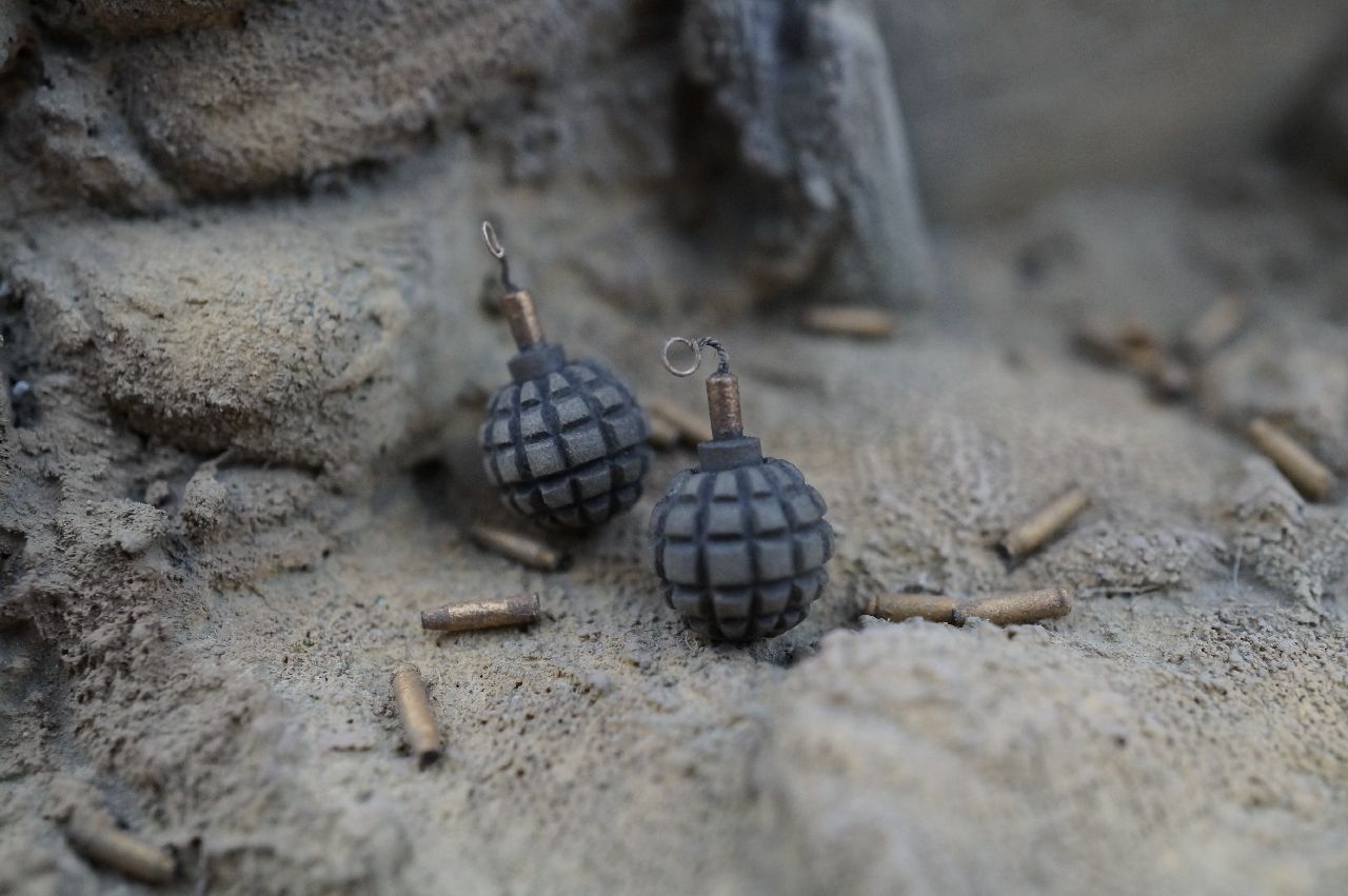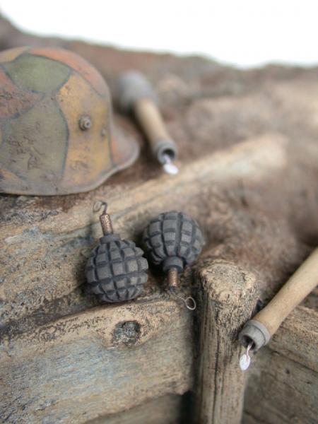 Tip: these are small parts so leave the grenades on the casting canal / blocks for preparing, fixing the wire pull cord and painting.